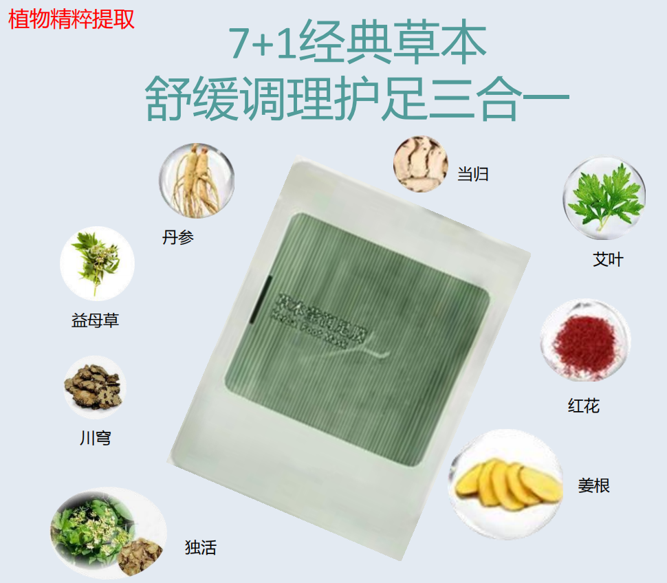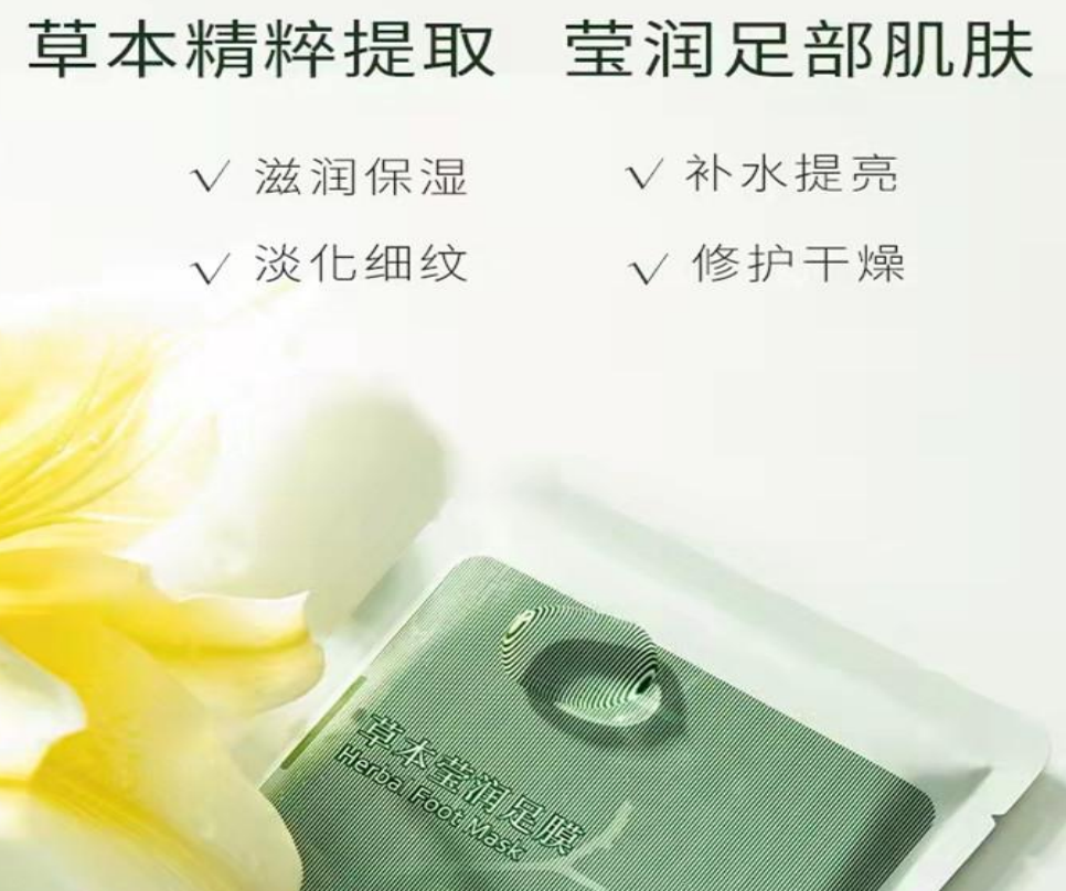 手足膜功效:蕴含当归、艾叶、丹参、益母草等多种草本中药,舒缓调理护足三合一。滋润保湿、修护干燥,莹润足部肌肤,让你轻松拥有一双小美脚。