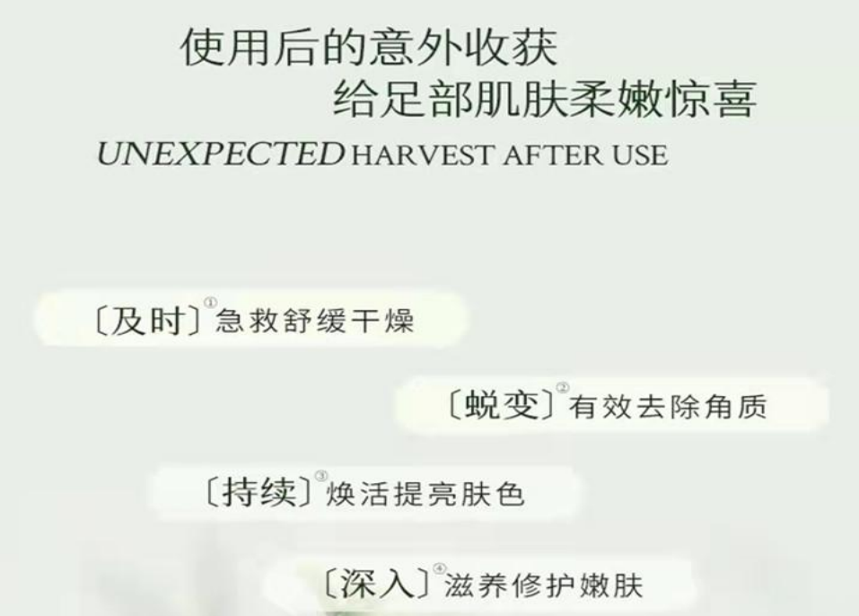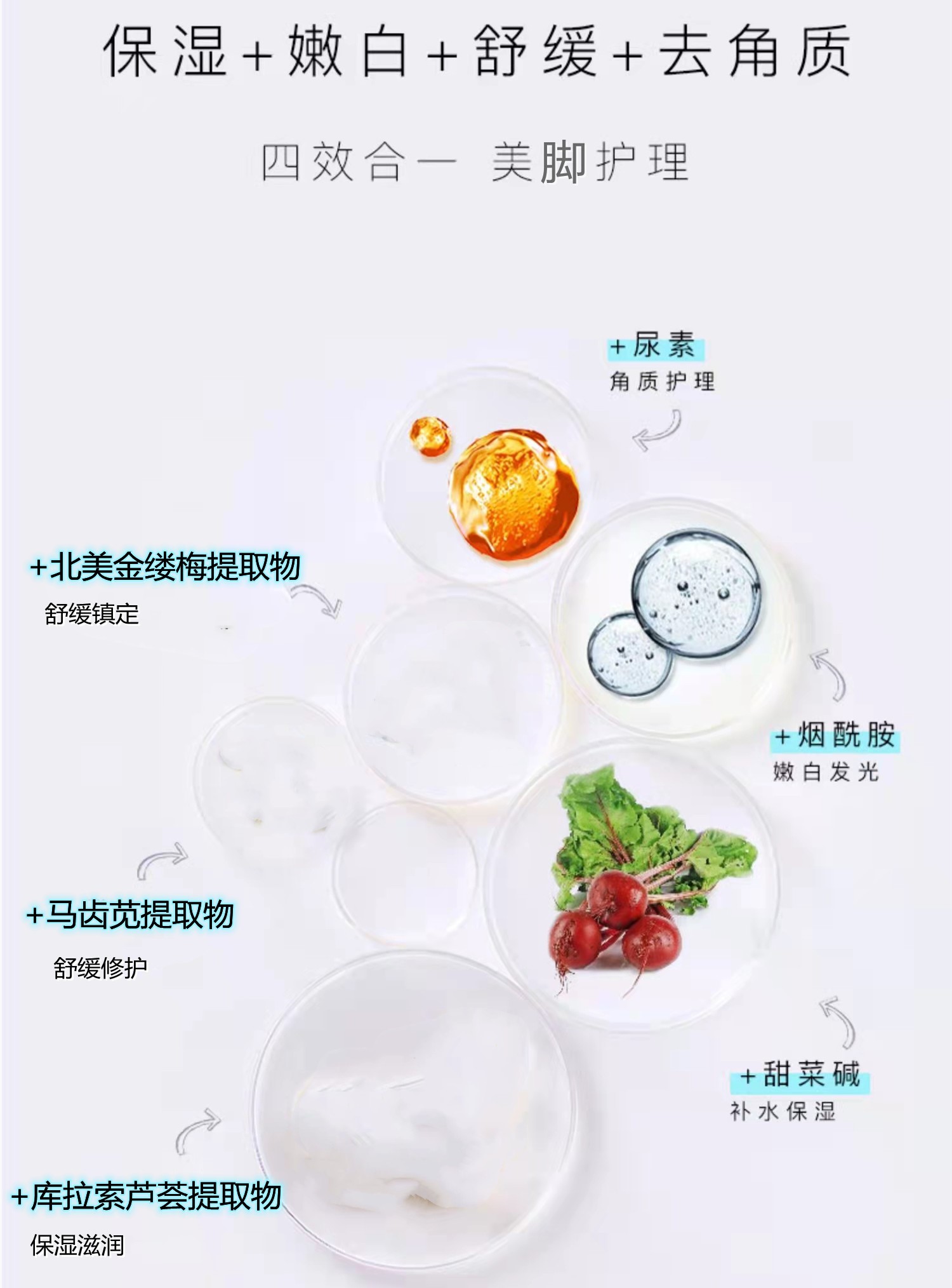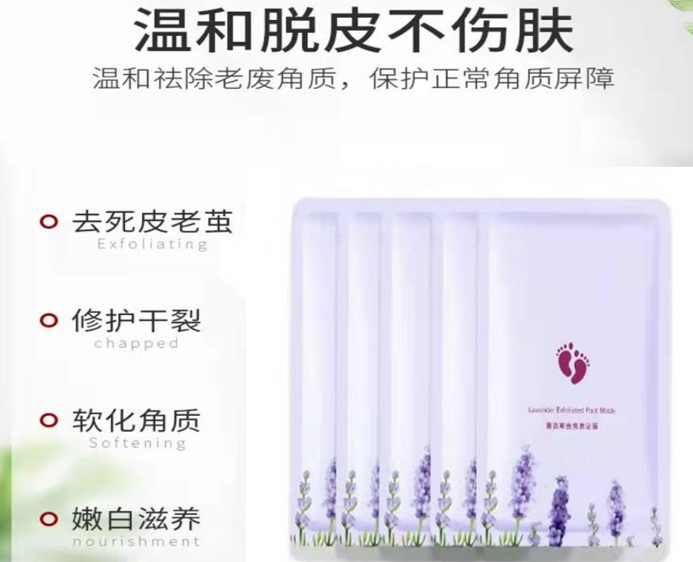 功效:蕴含薰衣草等多种天然植物精华,令足部老茧,角质层自然脱落,是肌肤柔软、细嫩、光泽,还你一双婴儿般的柔嫩玉足。
