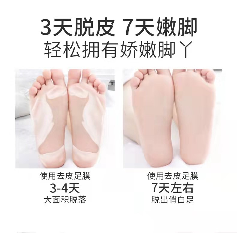 使用方法: 1.足部清洁擦干后,取出足膜,然后剪开封口。2.戴上足膜按摩膜套外部,让足部肌肤均匀接触到足膜精华液。3.撕开随附的不干胶,贴在脚腕处并固定,使用60-90分钟后,用清水冲洗干净。角质层较厚者可连续使用2-3双,使用后的一周内用温水泡足30分钟,静待角质脱落。